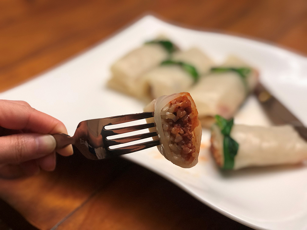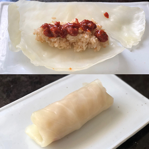 8.넓은 양배추 잎을 깔고 소금과 참기름으로 간 한 밥을 얹은 후 그 위에 쌈장을 적당량 올려 감싸 말아 준다.