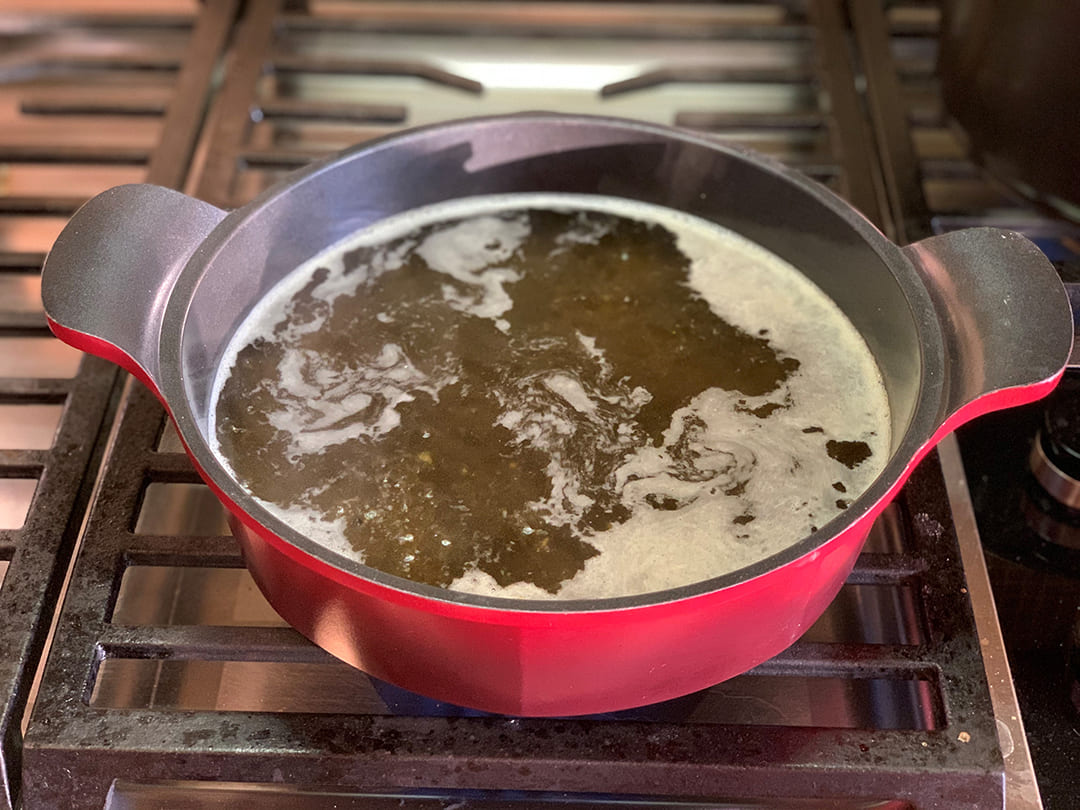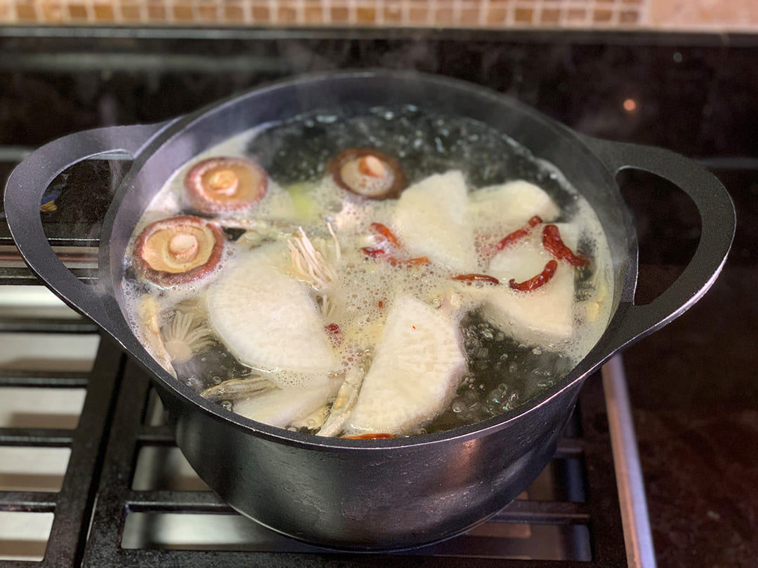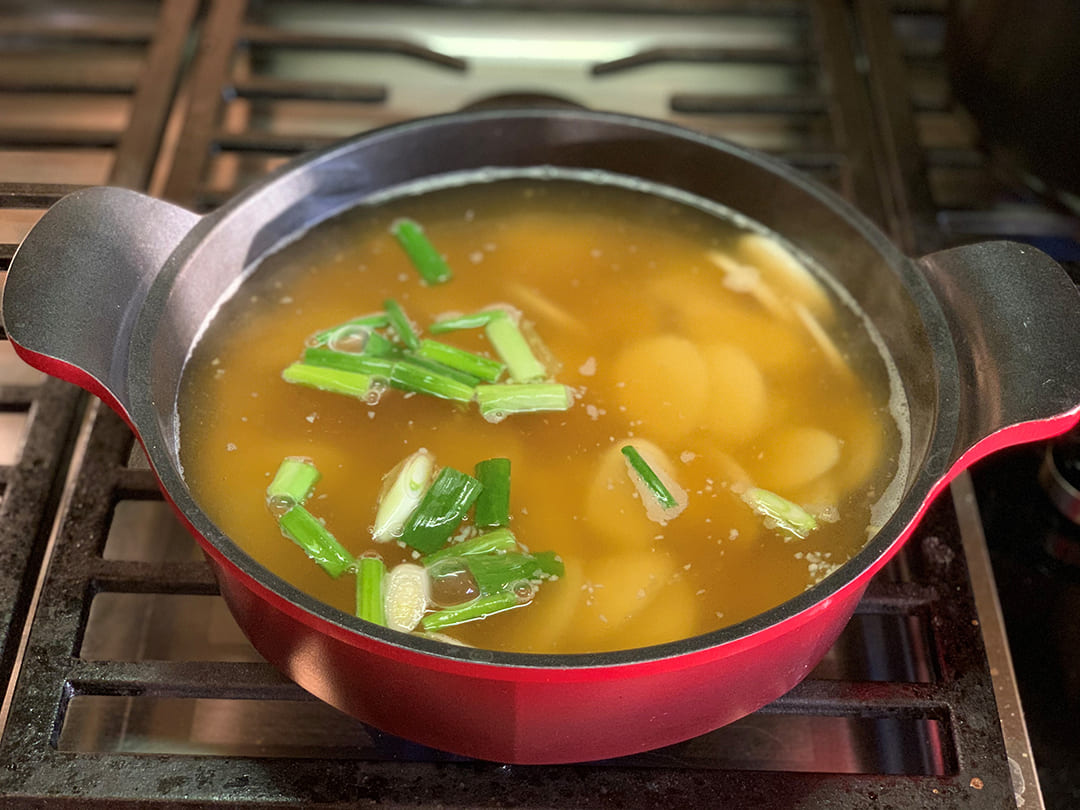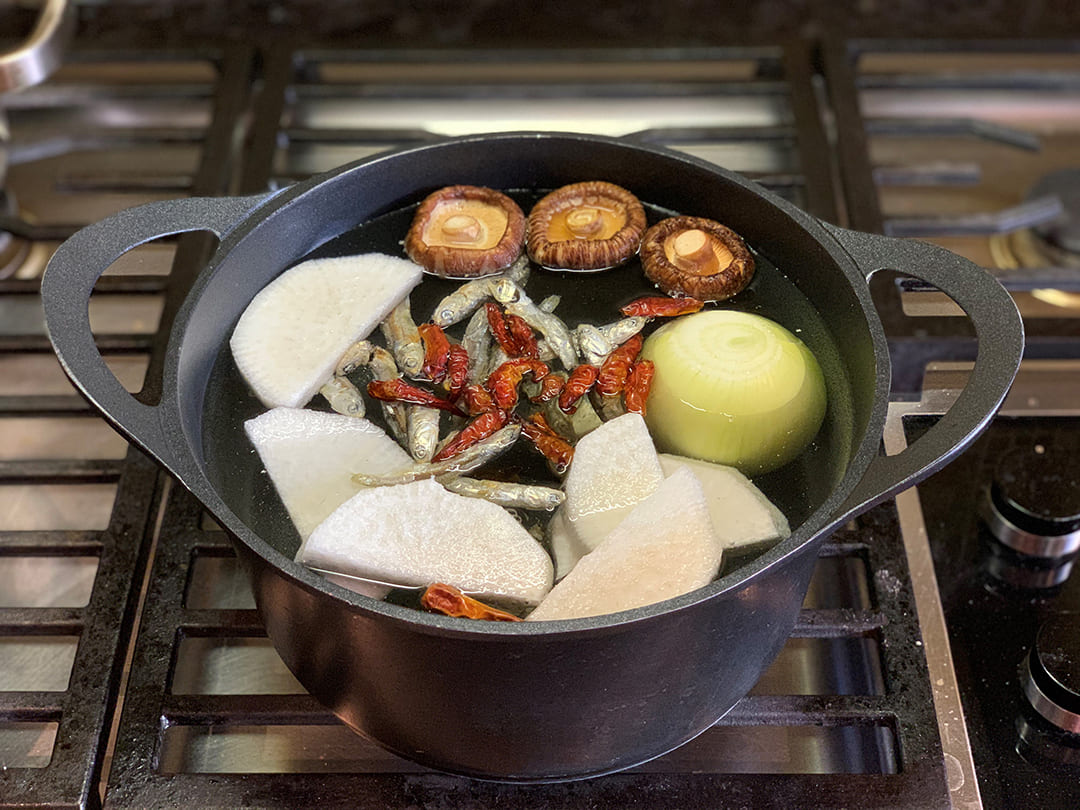 2.다시 멸치, 디포리, 양파, 무, 말린 표고 버섯, 파 뿌리 등을 넣고 국물이 노랗게 될 때까지 우려 주세요.