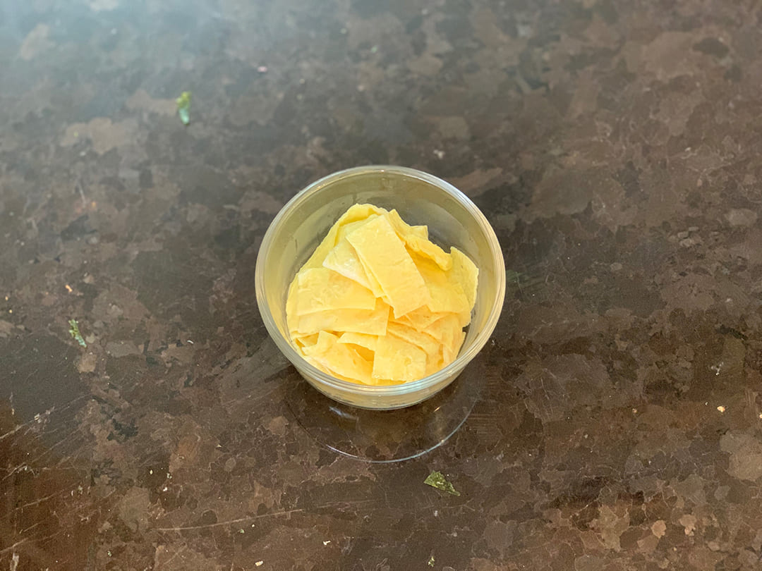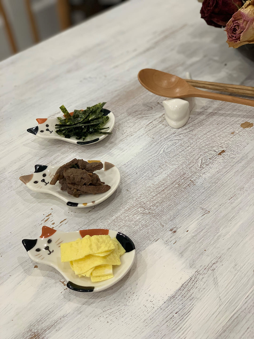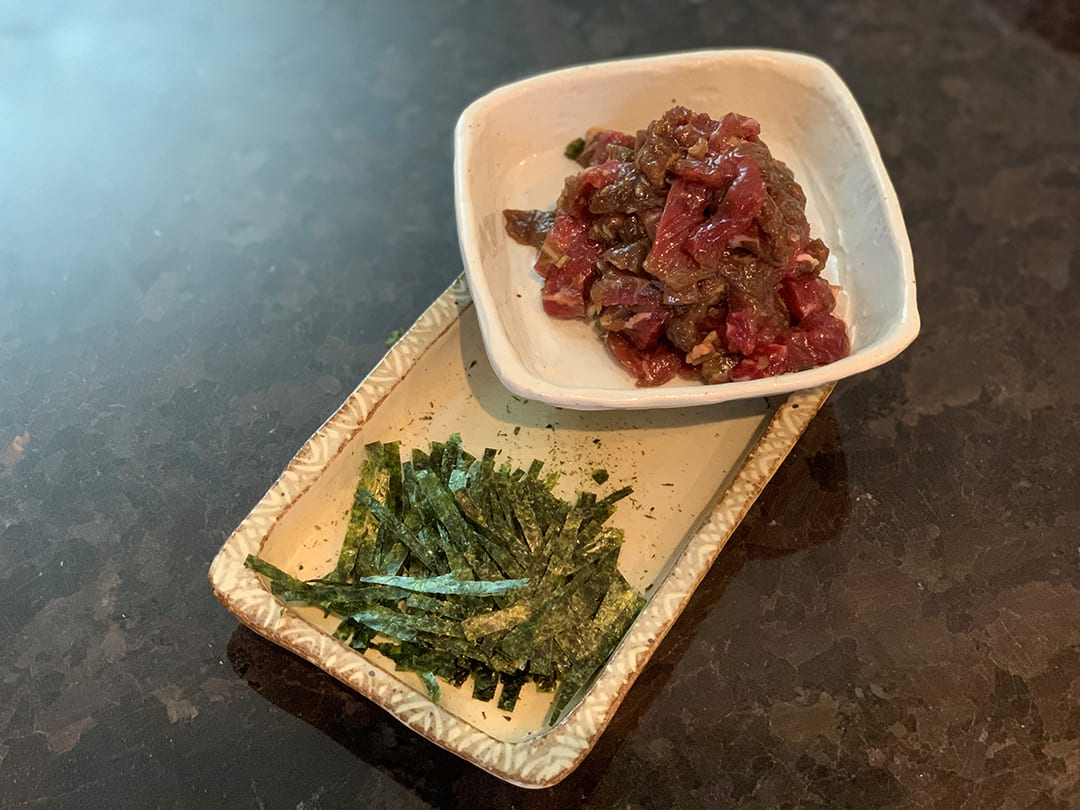 고명: 지단 용 계란 2개, 소고기 300g (설탕 1큰술, 간장 2큰술, 맛 술 1큰술, 다진 마늘 0.5큰술, 참기름 0.5큰술, 후추 약간), 구운 김 1장.
