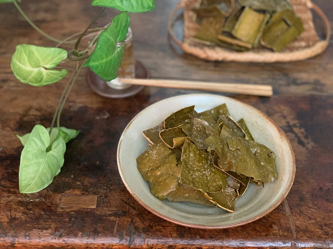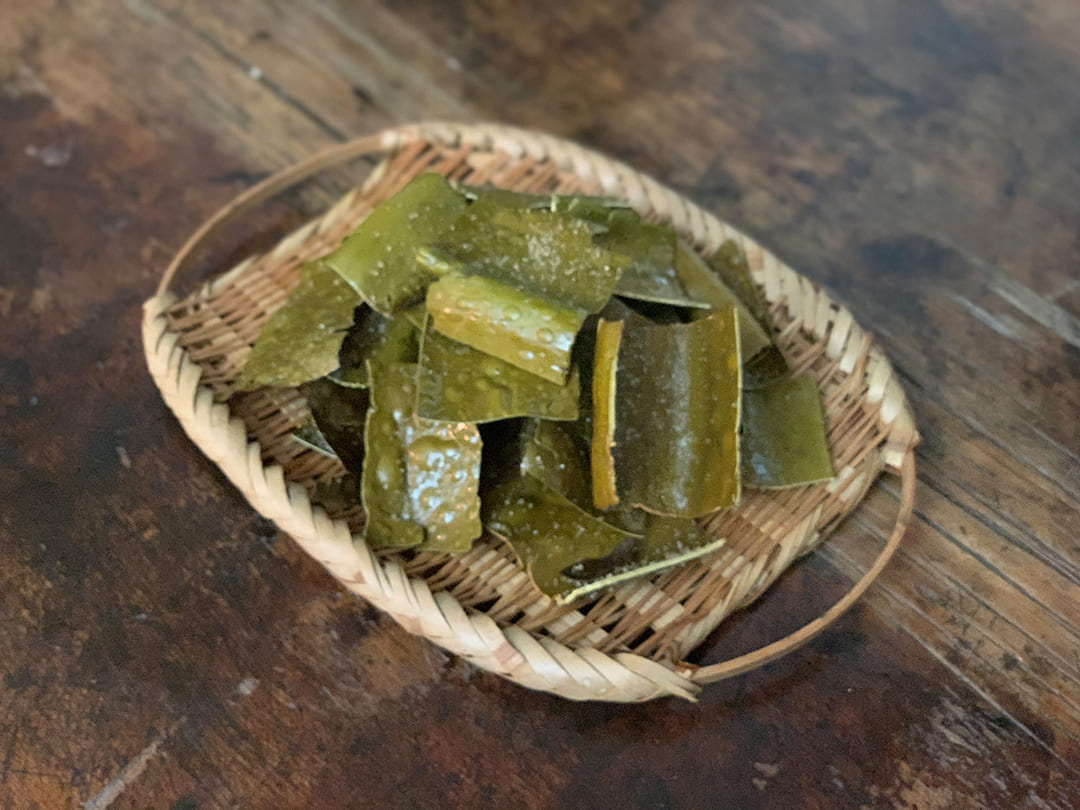 4.튀겨낸 다시마에 굵은 유기농 설탕을 뿌려 주어요.(다시마가 짜서 꽤 많이 뿌려 줘도 좋아요.)
