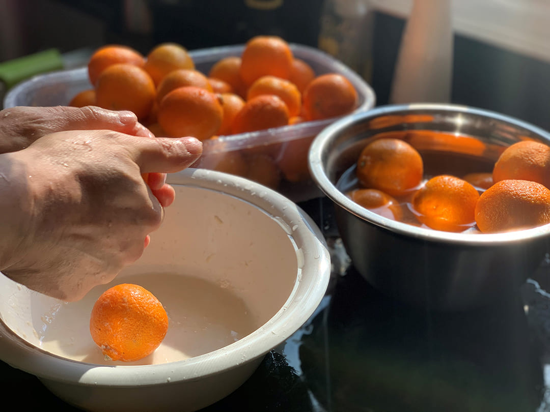 1.귤은 밀가루나 베이킹 소다를 듬뿍 묻혀 박박 문질러 씻어 주고 식초를 탄 물에 20분 정도 담가 두어요. (저는 만들어 놓은 아크릴 수세미 하나를 과일 용으로 따로 사용하기도 해요)